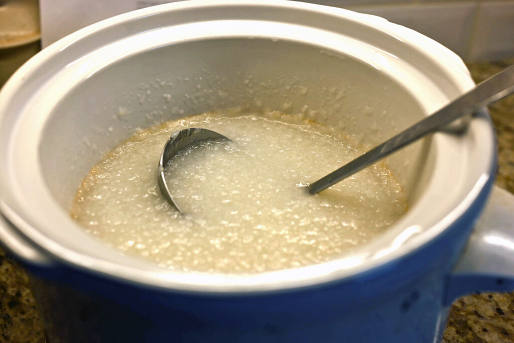 For me, 6 cups of water, half cup of rice (If I’m lazy, I might not even rinse the rice. Hey, there’s valuable starches that go down the drain!), throw it into a slow cooker the night before and set it for a 10 hour slow cook. Hearty extra ingredients like chicken or pork, I’d throw that in at the beginning. Otherwise, do it in the morning before I eat. Easy peasy lemon squeazy.