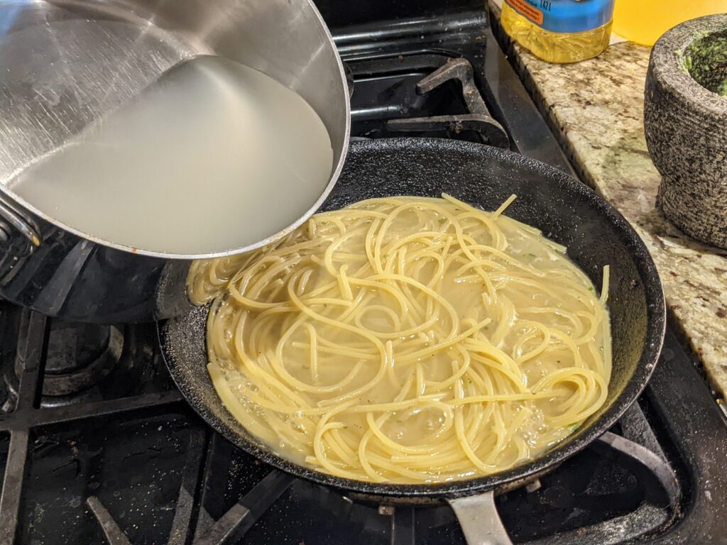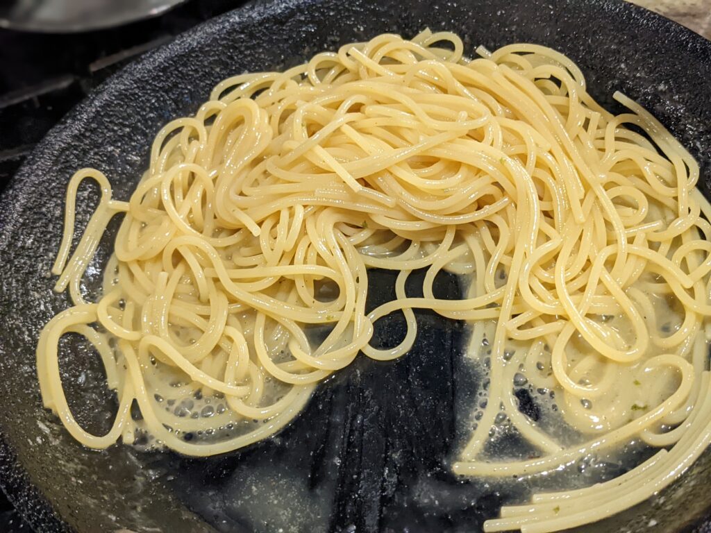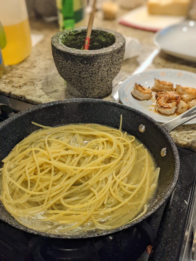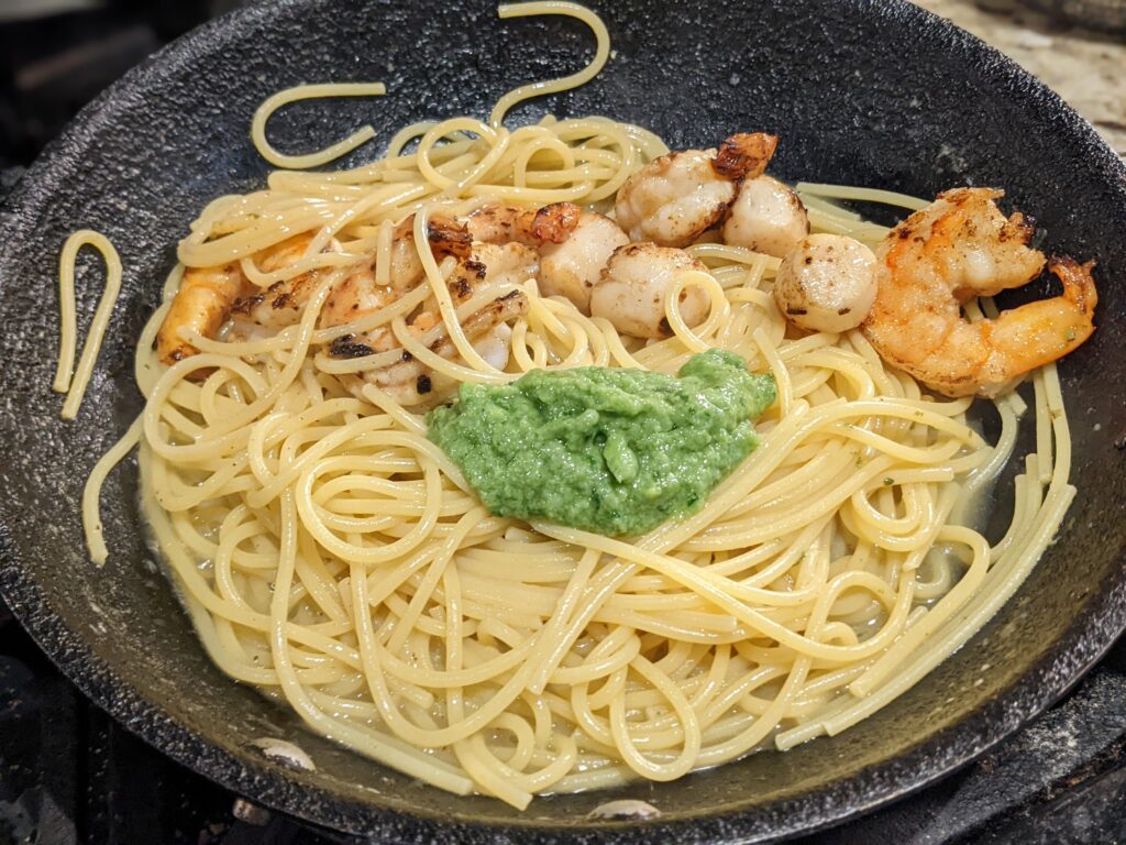 So with the pasta cooking in the same pan as the shellfish that had butter and lemon along with pasta water to deglaze and absorb into the pasta, mixing pesto into it gave me a result that I wasn’t intending. It was good but I’m not sure if I would care to repeat it and instead opt for something that’s more north American creamy and generally derided by the Italian purists.